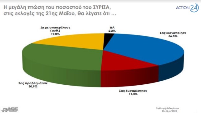Ιδιαίτερο ενδιαφέρουν παρουσιάζουν τα στοιχεία σχετικά με τη μεγάλη πτώση του ποσοστού του ΣΥΡΙΖΑ στις εκλογές της 21ης Μαΐου. Το 36,5% δήλωσε ικανοποίηση από το αποτέλεσμα, ενώ ένα 30,9% εμφανίζεται προβληματισμένο και ένα 11,4% δυσαρεστήθηκε από την ήττα.