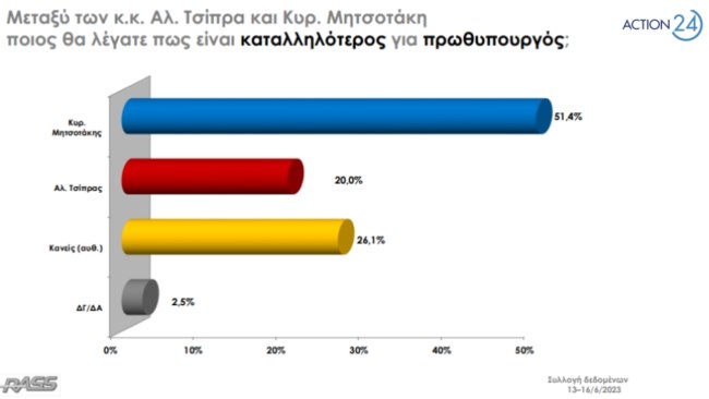 Είναι χαρακτηριστικό ότι στην καταλληλότητα για την πρωθυπουργία ο Κυριάκος Μητσοτάκης προηγείται με διαφορά 31,4% έναντι του Αλέξη Τσίπρα.