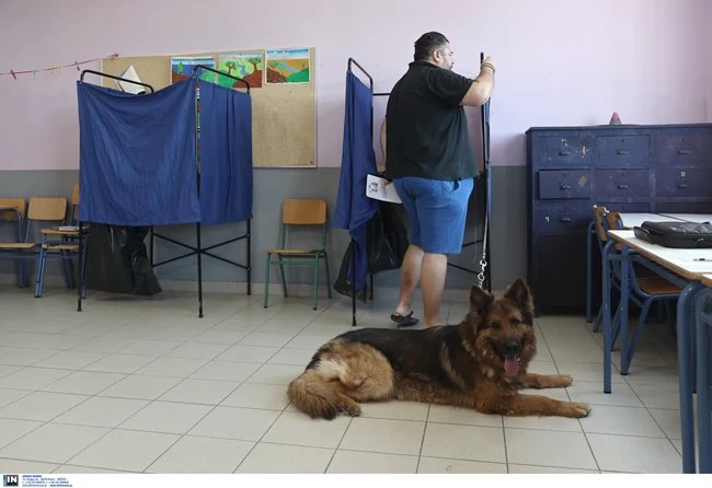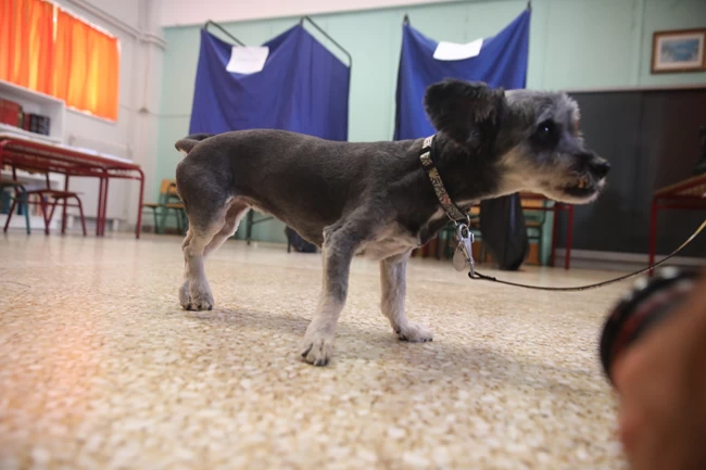 Οι ιδιοκτήτες τους τα κρατούν άλλοτε αγκαλιά και μαζί με αυτά ρίχνουν την ψήφο ενώ σε άλλες περιπτώσεις τα κατοικίδια περιμένουν υπομονετικά έξω από το παραβάν.