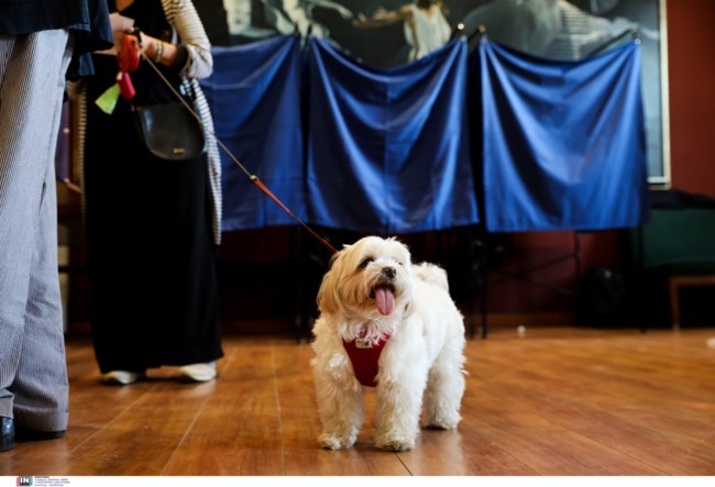 Όπως θα δείτε και στις φωτογραφίες, τα σκυλιά μπαίνουν μαζί με τους ιδιοκτήτες στο παραβάν για να ψηφίσουν.