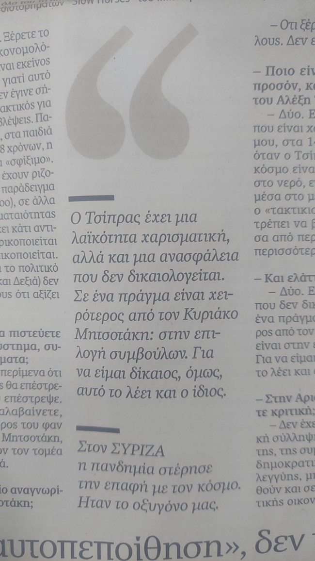 Σε συνέντευξή του στην "Καθημερινή", ο πρώην υπουργός Οικονομικών αφού αναφέρει ως τα μεγαλύτερα προσόντα του Αλέξη Τσίπρα τη "λαϊκότητα" και τον "τακτικισμό" -υπονοοώντας ότι ο ίδιος προσωπικά δεν τα διαθέτει- περνάει στα ελαττώματα του Αλέξη Τσίπρα μην διστάζοντας να πει ότι στην επιλογή συμβούλων ο πρόεδρος του ΣΥΡΙΖΑ είναι χειρότερος από τον Κυριάκο Μητσοτάκη.