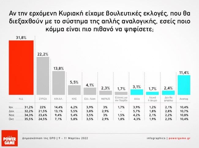 Σε ένα σκηνικό αβεβαιότητας τόσο λόγω της εισβολής της Ρωσίας στην Ουκρανία όσο και στις σοβαρές επιπτώσεις στην οικονομική ζωή, η ΝΔ εξακολουθεί να διατηρεί προβάδισμα 9,6 ποσοστιαίων μονάδων έναντι του ΣΥΡΙΖΑ, σύμφωνα με το Βαρόμετρο της GPO για το powergame.gr.
