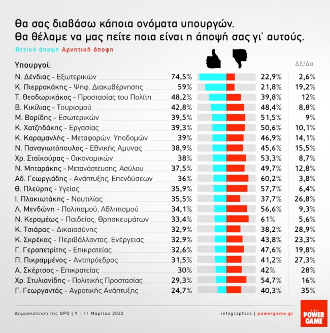 Ο υπουργός Εξωτερικών κ. Νίκος Δένδιας, στην πρώτη θέση της σχετικής λίστας, εξακολουθεί να διατηρεί υψηλά ποσοστά θετικών γνωμών (74,5%). Ο υπουργός Ψηφιακής Διακυβέρνησης κ. Κυριάκος Πιερρακάκης είναι στη δεύτερη θέση με το 59% των θετικών γνωμών. Ακολουθούν ο υπουργός Προστασίας του Πολίτη κ. Τάκης Θεοδωρικάκος με 48,2%, ο υπουργός Τουρισμού κ. Βασίλης Κικίλιας με 42,8%, ο υπουργός Εσωτερικών κ. Μάκης Βορίδης με 39,5%. Την πρώτη εξάδα συμπληρώνει ο υπουργός Εργασίας κ. Κωστής Χατζηδάκης με 39,3%.