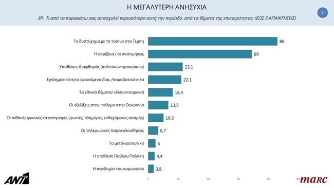 Στις μεγαλύτερες ανησυχίες των πολιτών, πρώτη είναι η τραγωδία στα Τέμπη, με 86%, ακολουθεί η ακρίβεια και οι ανατιμήσεις, με 69%, ενώ τρίτη έρχεται η διαφθορά (με έμφαση στα πολιτικά πρόσωπα) με 23%.