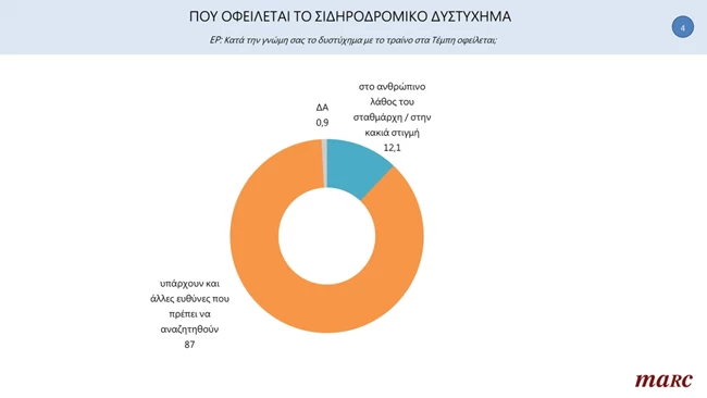 Μόλις το 12,1% ρίχνει την κύρια ευθύνη για το δυστύχημα στα Τέμπη στον σταθμάρχη, ενώ το 87% θεωρεί ότι θα πρέπει να αναζητηθούν ευρύτερες ευθύνες.
