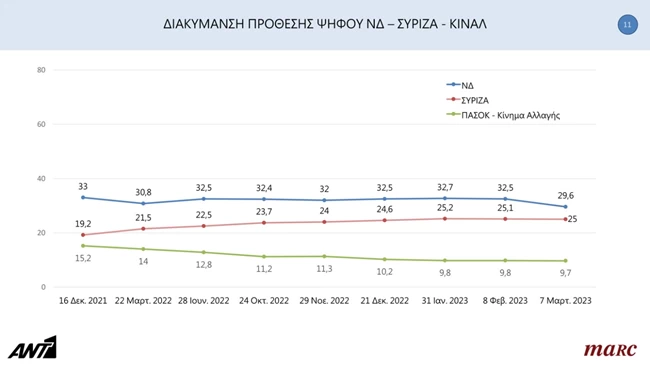 Στις 4,6 ποσοστιαίες μονάδες διαμορφώνεται η διαφορά μεταξύ ΝΔ και ΣΥΡΙΖΑ, όπως δείχνει η πρώτη δημοσκόπηση μετά την τραγωδία στα Τέμπη, της εταιρείας Marc για λογαριασμό του ΑΝΤ1.