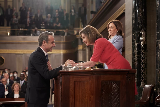Η πρόεδρος της Βουλής των αντιπροσώπων των ΗΠΑ Νάνσι Πελόζι, απένειμε δημόσια τα εύσημα στον πρωθυπουργό για την ομιλία του στο Κογκρέσο.