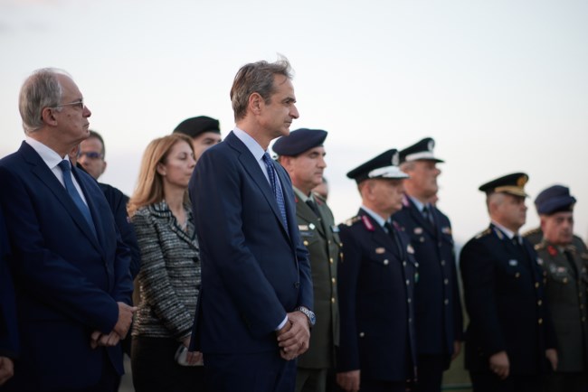 Ο Κυριάκος Μητσοτάκης συνέχισε στον χαιρετισμό του: "Τα τρία αυτά γράμματα, απαντούν μόνο σε όσους απειλούν και δεν προκαλούν αλλά προσκαλούν στον δρόμο της νομιμότητας, στον δρόμο της ειρήνης, γι' αυτό και η άλλη όψη του ελληνικού ΟΧΙ είναι το ΝΑΙ στην σταθερότητα, στη συνεργασία.