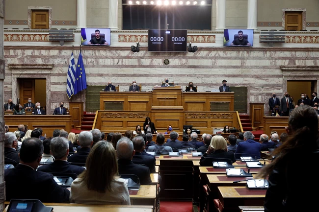 Η τοποθέτηση του Ουκρανού προέδρου μεταδόθηκε διαδικτυακά στην αίθουσα της Ολομέλειας. Στην ειδική εκδήλωση παρόντες ήταν ο Κυρ. Μητσοτάκης, ο Αλ. Τσίπρας, ο Μιχ. Κατρίνης και οι βουλευτές των κομμάτων τους. Οι πτέρυγες και οι πολιτικοί αρχηγοί του ΚΚΕ και της Ελληνικής Λύσης δήλωσαν πως θα απόσχουν, ενώ το ΜέΡΑ25, που επίσης διαφωνεί, εκπροσωπήθηκε από έναν βουλευτή.