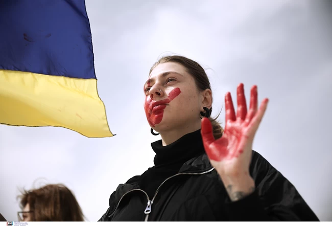 Καθ΄όλη τη διάρκεια της ομιλίας του Β. Ζελένσι στη Βουλή, Ουκρανοί πολίτες που ζουν στην Ελλάδα βρίσκονταν συγκεντρωμένοι στην πλατεία Συντάγματος.