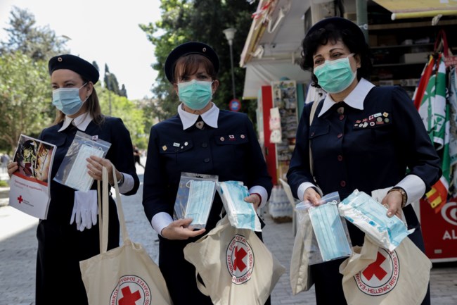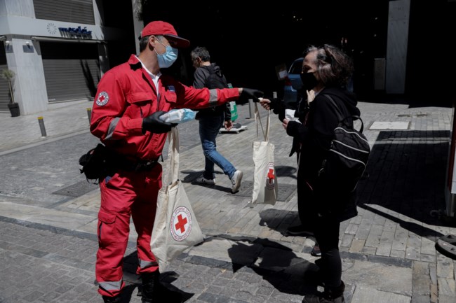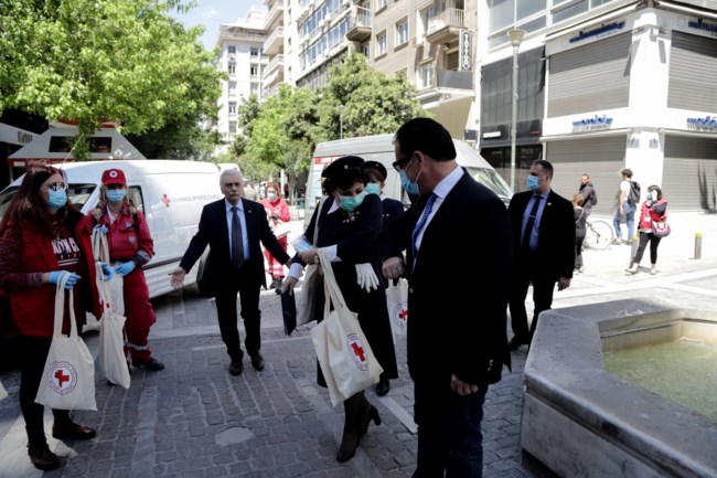 Μάσκες, αντισηπτικά και ενημερωτικό υλικό διένειμαν στον πεζόδρομο της Ερμού, στο κέντρο της Αθήνας, με την ευκαιρία της Παγκόσμιας Ημέρας Ερυθρού Σταυρού/Ερυθράς Ημισελήνου, ο υπουργός Ανάπτυξης και Επενδύσεων, 'Αδωνις Γεωργιάδης μαζί με τον πρόεδρο του Ελληνικού Ερυθρού Σταυρού (ΕΕΣ), Αντώνη Αυγερινό και εθελόντριες και εθελοντές του ΕΕΣ.