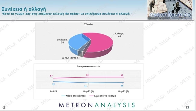 Εξαιρετικά ενδιαφέρουσα η απάντηση των πολιτικών για το αν θέλουν συνέχεια ή αλλαγή. Το 63%, δηλαδή 2 στους 3, απαντούν ότι θέλουν αλλαγή και το 34% ότι θέλουν συνέχεια.