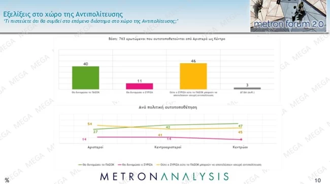 Τα αποτελέσματα δείχνουν περαιτέρω εκλογική υποχώρηση και καταγράφουν τη συνθήκη κρίσης στην αξιωματική αντιπολίτευση αλλά η πλειοψηφία (46%) εκτιμά πως ούτε το ΠΑΣΟΚ ούτε ο ΣΥΡΙΖΑ μπορούν να αποτελέσουν ισχυρή αντιπολίτευση. Διαπιστώνεται, όμως, ότι 4 στους 10 κεντροαριστερούς πιστεύουν πως θα δυναμώσει το ΠΑΣΟΚ.