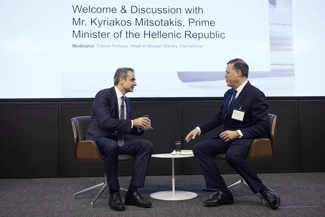 Ο Πρωθυπουργός Κυριάκος Μητσοτάκης παρέστη και συμμετείχε σε συζήτηση, σήμερα το πρωί, στα γραφεία της Morgan Stanley, στο Λονδίνο, στο πλαίσιο του Ελληνικού Επενδυτικού Συνεδρίου που διοργανώνει η τράπεζα σε συνεργασία με το Χρηματιστήριο Αθηνών.