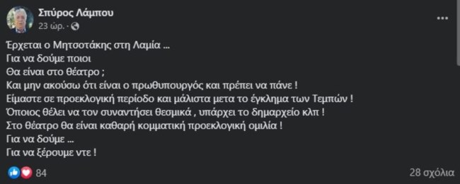 "Έρχεται ο Μητσοτάκης στη Λαμία... Για να δούμε ποιοι θα είναι στο θέατρο; Και μην ακούσω ότι είναι ο πρωθυπουργός και πρέπει να πάνε! Είμαστε σε προεκλογική περίοδο και μάλιστα μετά το έγκλημα των Τεμπών!