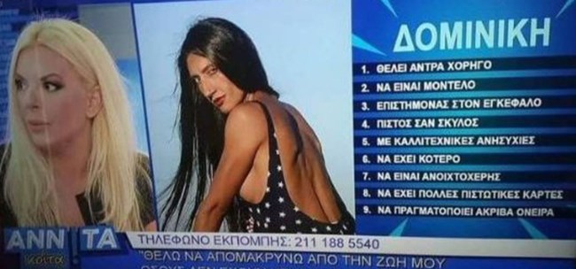 Η υποψήφια βουλευτής των Σπαρτιατών, το 2019, είχε πάρει μέρος στην εκπομπή "Αννίτα Κοίτα" με την Αννίτα Πάνια, όπου έψαχνε "έναν άντρα να πραγματοποιεί τα ακριβά της όνειρα".