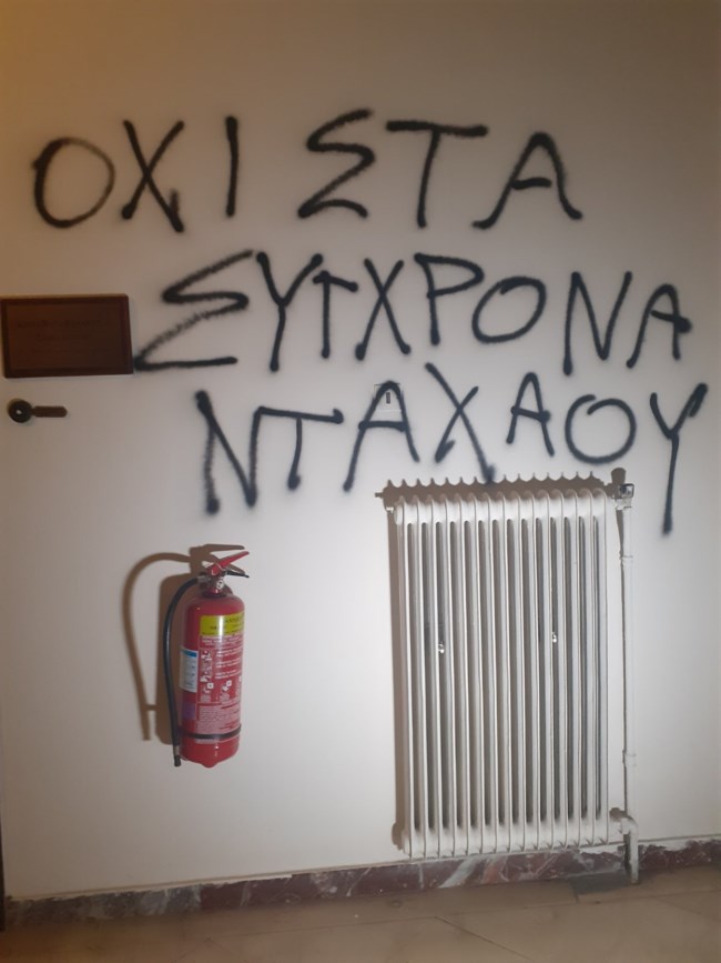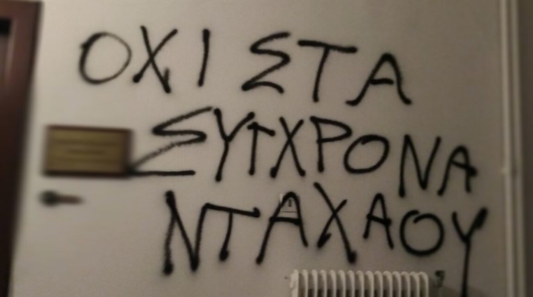 Συνθήματα στο πολιτικό γραφείο του υπουργού Μετανάστευσης Νότη Μηταράκη στην οδό Δημοκρίτου στο Κολωνάκι έγραψε το βράδυ της Τετάρτης ομάδα ατόμων.