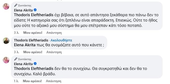 Έντονο διάλογο είχαν στο Facebook η Έλενα Ακρίτα και ο Θοδωρής Ελευθεριάδης, γιος της 55χρονης Μαρίας Εγούτ που έχασε τη ζωή της στο δυστύχημα των Τεμπών.