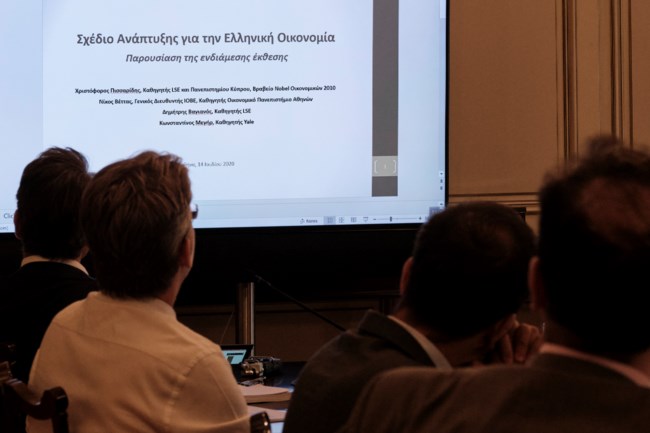 Την ενδιάμεση έκθεσή της για το σχέδιο ανάπτυξης της ελληνικής οικονομίας παρουσίασε στην κυβέρνηση η "Επιτροπή Πισσαρίδη" σε τηλεδιάσκεψη υπό τον Πρωθυπουργό Κυριάκο Μητσοτάκη.