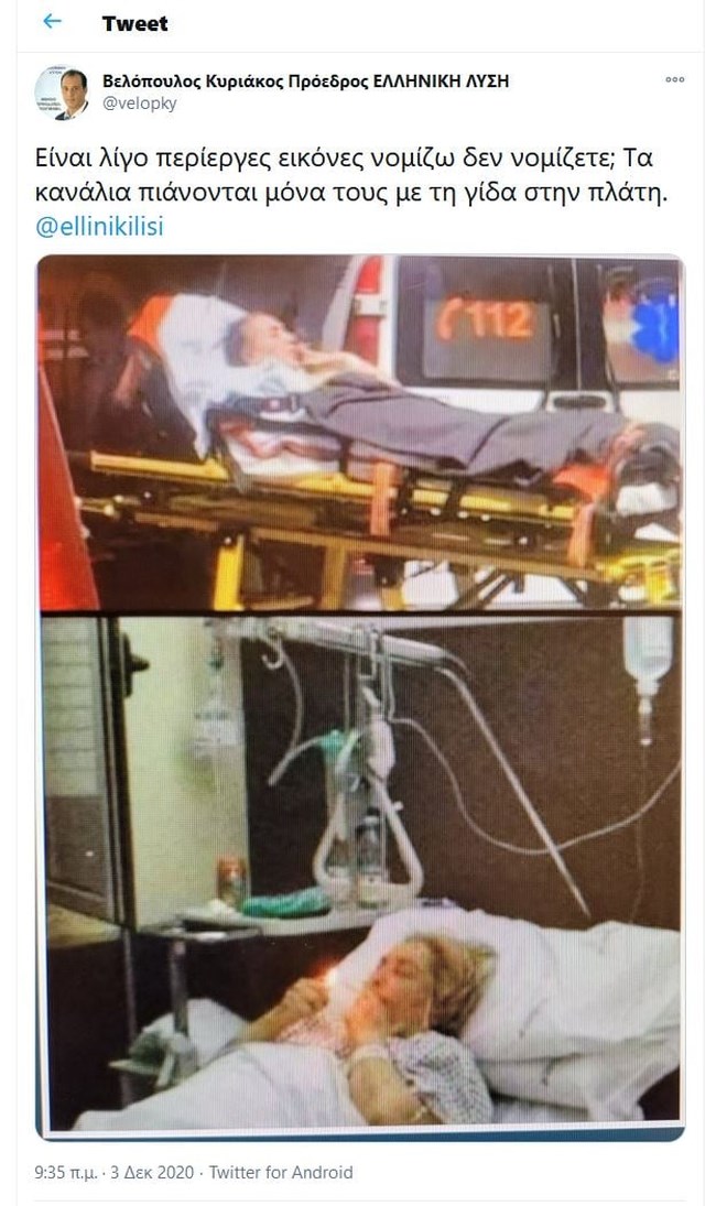 Fake news σχετικά με τον κορονοϊό συνεχίζει να διαδίδει ο πρόεδρος του κόμματος "Ελληνική Λύση", Κυριάκος Βελόπουλος, ο οποίος ανήρτησε στον προσωπικό του λογαριασμό στο Twitter δύο παλιές φωτογραφίες παρουσιάζοντάς τις ως σχετικές με την πανδημία.