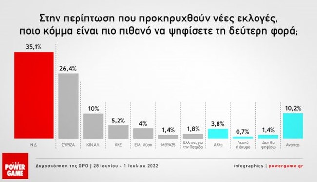 Η μικρή άνοδος της ΝΔ και του ΣΥΡΙΖΑ καταγράφεται την ώρα που το ΠΑΣΟΚ-ΚΙΝΑΛ εμφανίζει μικρή πτώση, στις 11,1 ποσοστιαίες μονάδες (από 11,8% στη μέτρηση του Μαΐου).