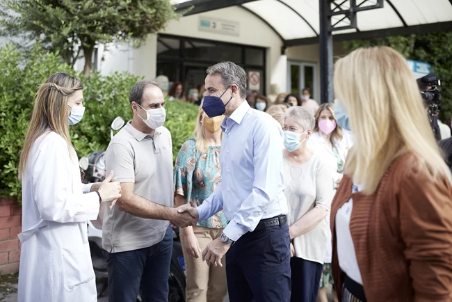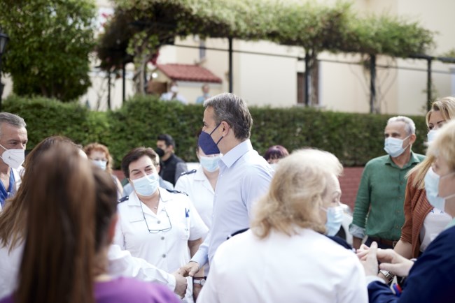 Ο Κυριάκος Μητσοτάκης συναντήθηκε και συζήτησε με το ιατρικό και νοσηλευτικό προσωπικό που συμμετέχει στο νέο πρόγραμμα "ΟΙΚΟΘΕΝ" υπό τον υπεύθυνο ιατρό, Μιχάλη Νικολάου, για τη χορήγηση θεραπειών σε ογκολογικούς ασθενείς στο σπίτι και ενημερώθηκε για τη λειτουργία του νέου προγράμματος.
