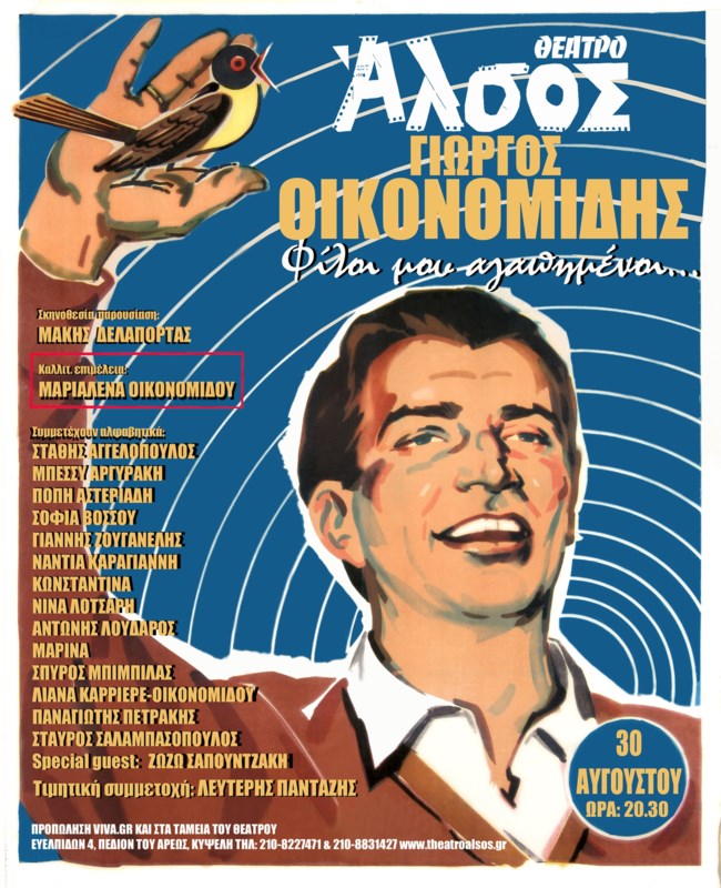 Μια μεγάλη συναυλία-αφιέρωμα για τον αγαπημένο κονφερασιέ, ηθοποιό, ποιητή, συγγραφέα και τραγουδιστή Γιώργο Οικονομίδη, θα πραγματοποιηθεί, την Τετάρτη 30 Αυγούστου στο θέατρο Άλσος, από την κόρη του Μαριαλένα Οικονομίδου, σε σκηνοθεσία και παρουσίαση του Μάκη Δελαπόρτα.